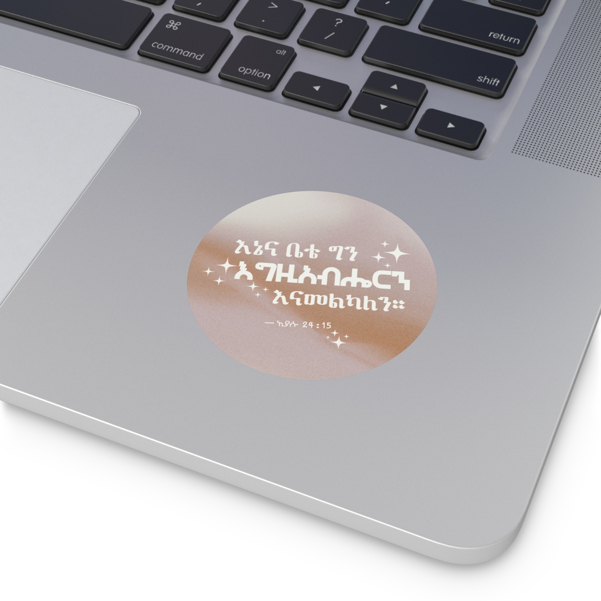 Perfect for laptops, water bottles, Bible covers, planners, journals, mirrors, and home décor. Designed in elegant Amharic script, this sticker brings a timeless statement of faith.