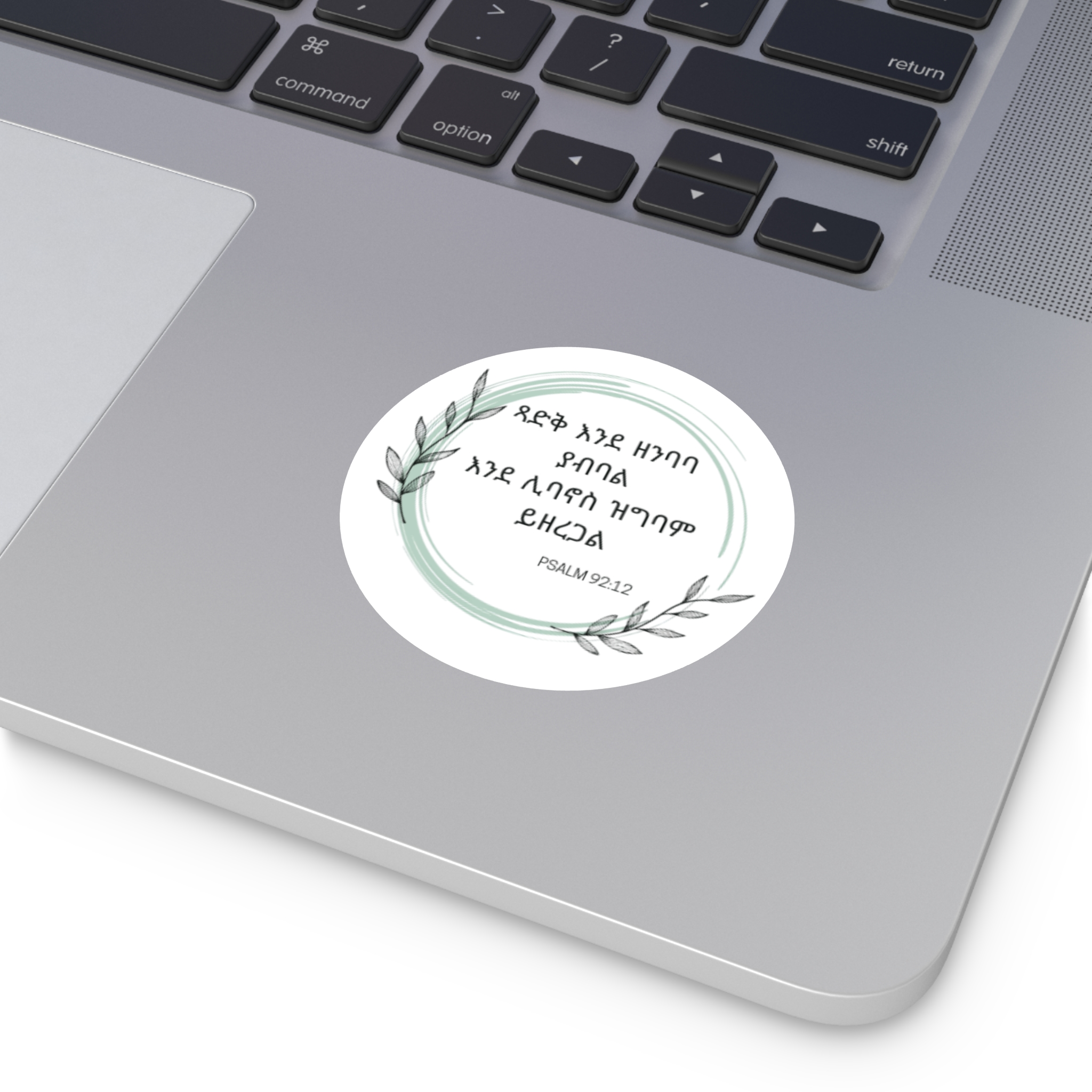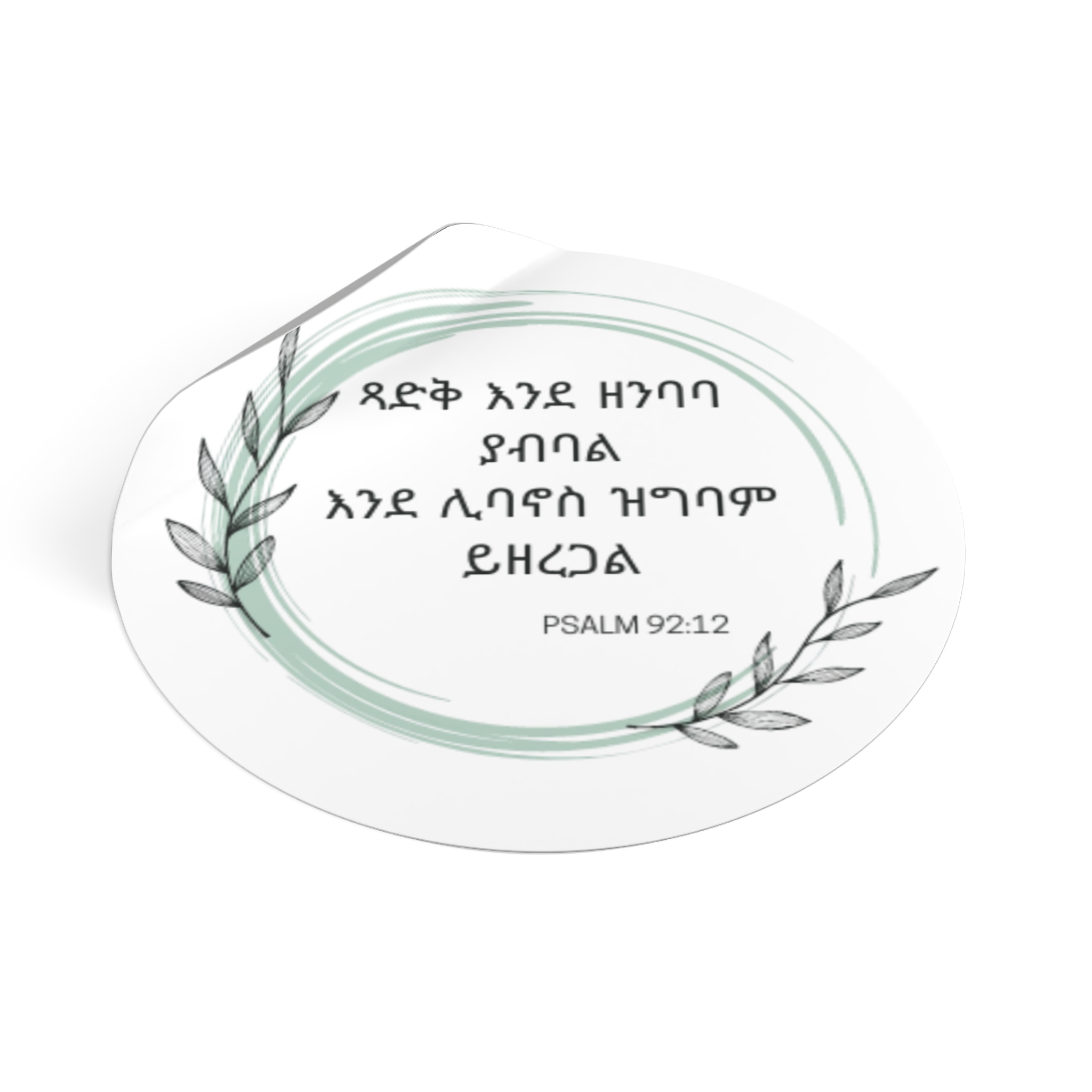 Celebrate God’s promise with this beautiful Psalm 92:12 sticker, featuring the verse “ጻድቃን እንደ ዘንባባ ይንሰራፋሉ” — “The righteous will flourish like a palm tree.”