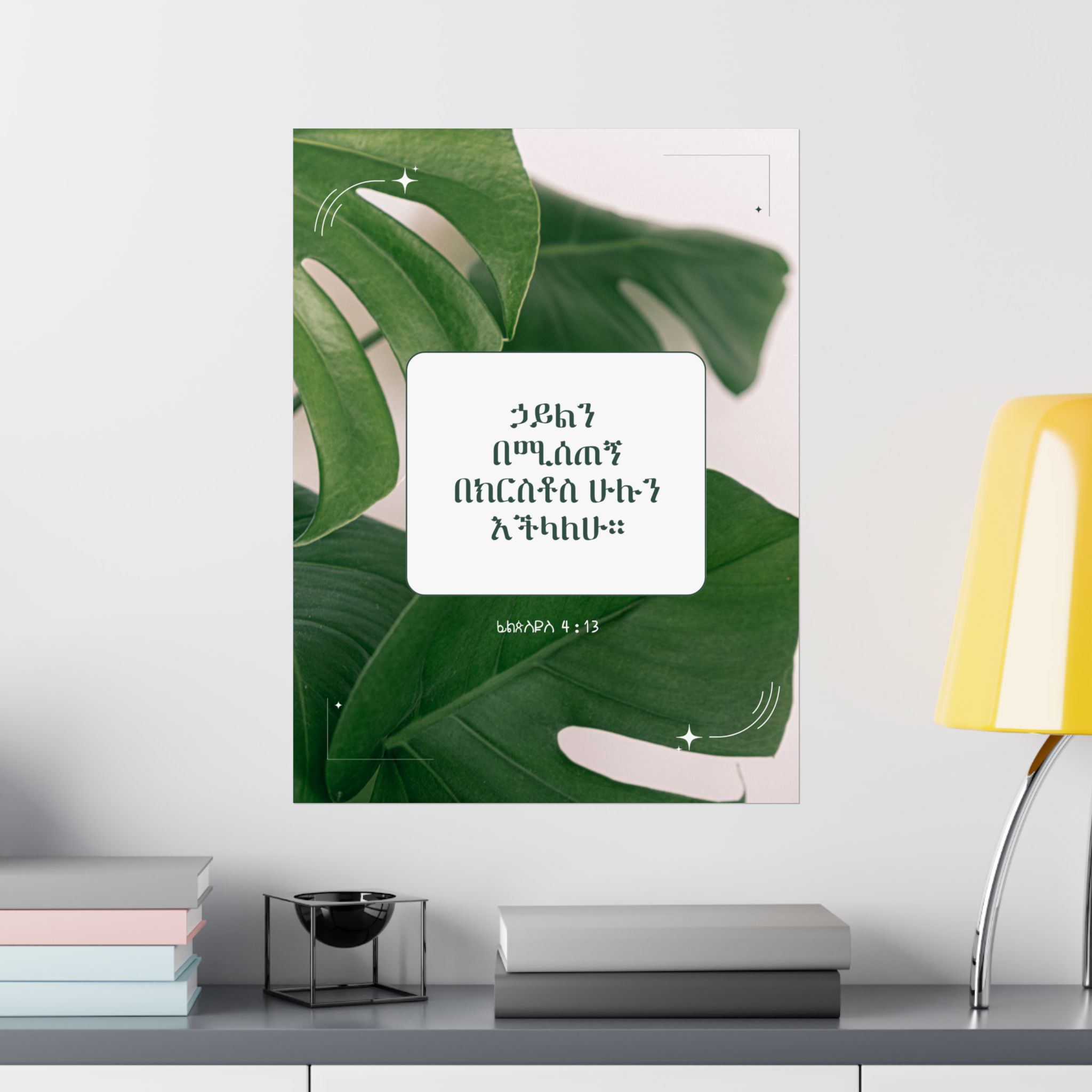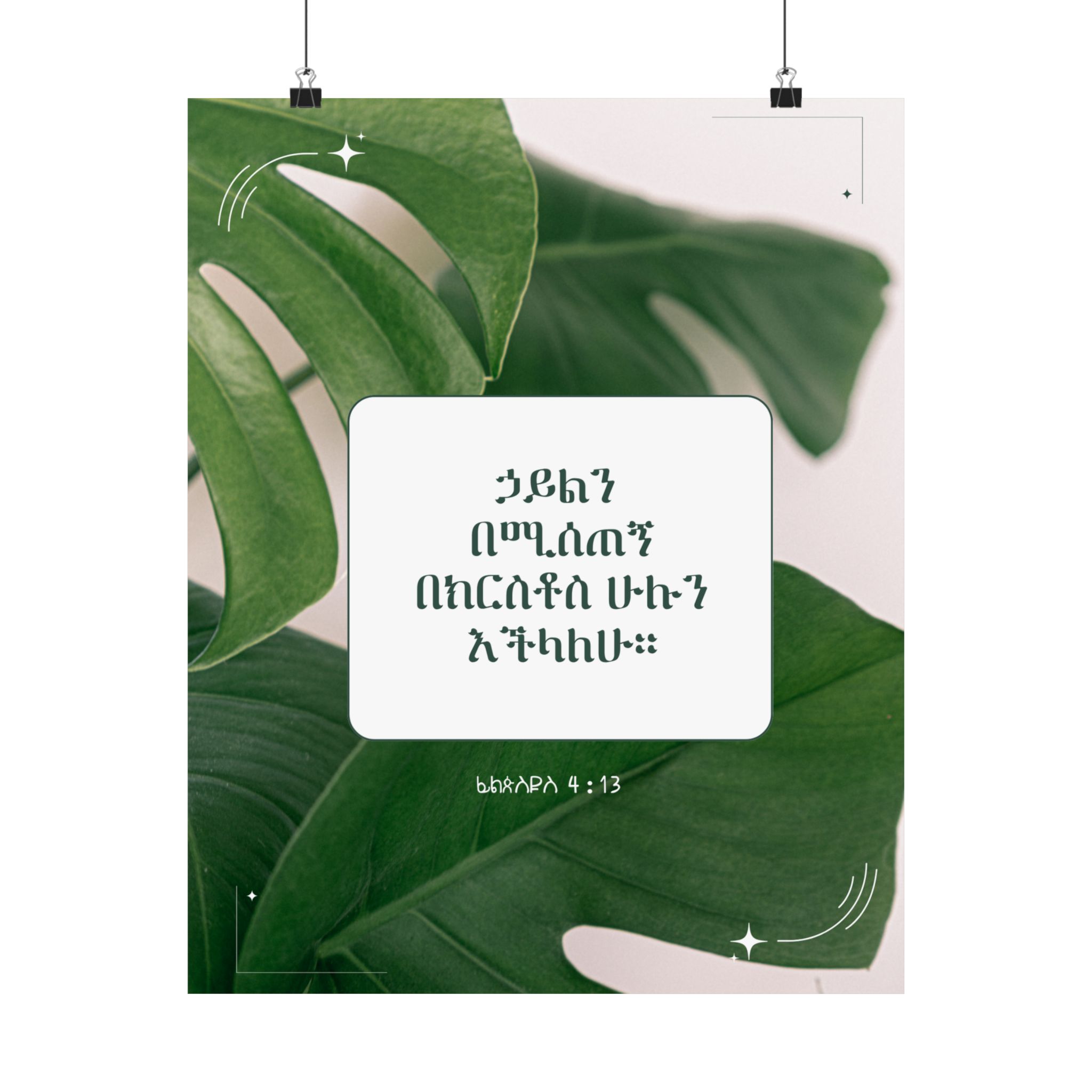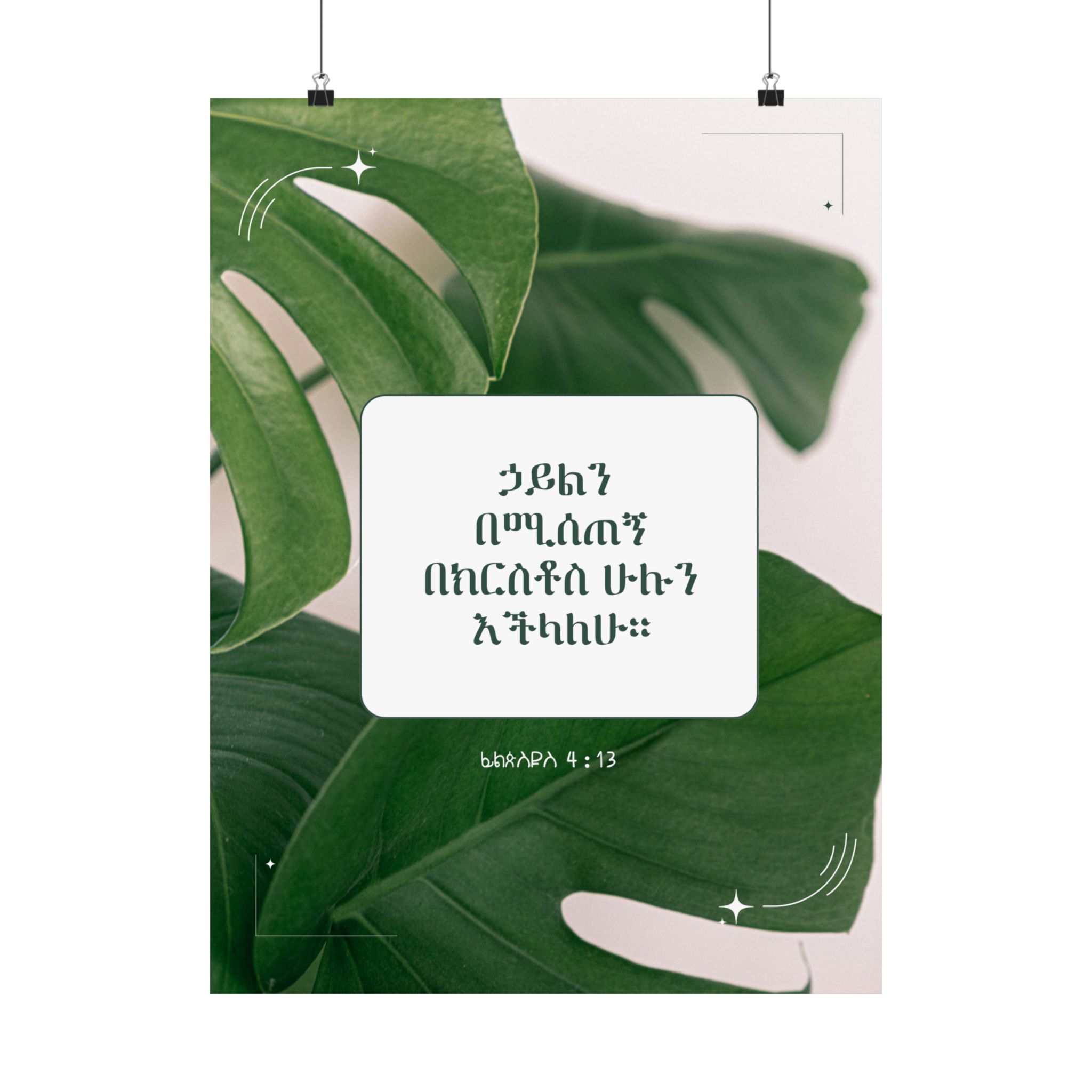 Bring faith and inspiration into your home with this Amharic poster featuring ፊሊጵስዩስ 4፥13.